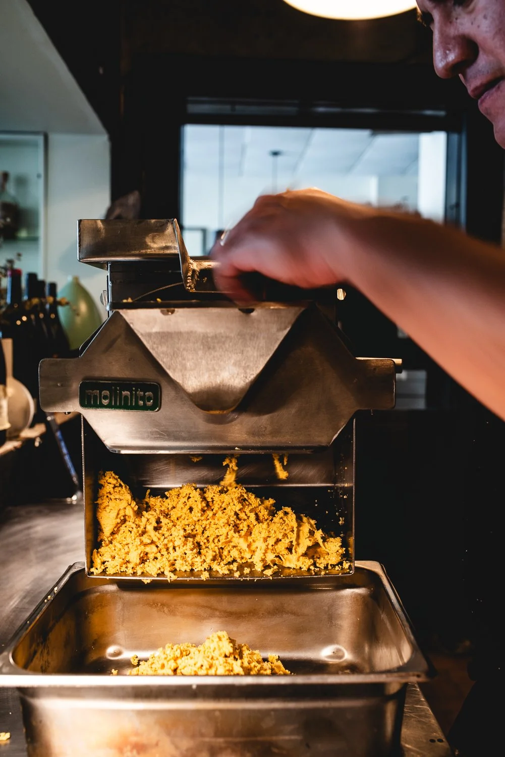 Each night at Alma, we nixtamalize the corn in-house—an ancient pre-Columbian process that softens the grain, enhances nutrition, and unlocks its full flavour. Every morning, we grind fresh masa and hand-shape each tortilla, forming the base of many of our traditional Mexican dishes. Alma is proud to be among the first restaurants in Canada to work with freshly nixtamalized corn, honouring this vital aspect of Mexico’s culinary heritage.